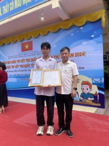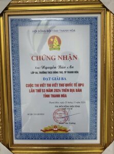 Trong buổi lễ em Nguyễn Bảo An, học sinh lớp 9A trường THCS Đông Thọ, với thành tích giải Ba cấp tỉnh. Thành công của em không chỉ là niềm tự hào của gia đình và nhà trường, mà còn khẳng định chất lượng giáo dục của THCS Đông Thọ – một trong những điểm sáng về phong trào bồi dưỡng học sinh giỏi. Thành tích này cũng là sự ghi nhận cho sự tận tâm, hướng dẫn nhiệt tình của các thầy cô trường THCS Đông Thọ. Sự đồng hành của đội ngũ giáo viên đã giúp các em học sinh tự tin, phát huy hết khả năng sáng tạo trong từng bài viết.