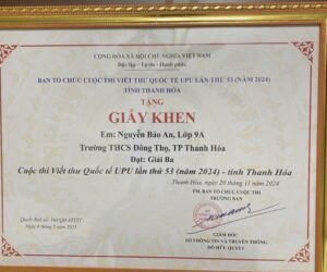 Trong buổi lễ em Nguyễn Bảo An, học sinh lớp 9A trường THCS Đông Thọ, với thành tích giải Ba cấp tỉnh. Thành công của em không chỉ là niềm tự hào của gia đình và nhà trường, mà còn khẳng định chất lượng giáo dục của THCS Đông Thọ – một trong những điểm sáng về phong trào bồi dưỡng học sinh giỏi. Thành tích này cũng là sự ghi nhận cho sự tận tâm, hướng dẫn nhiệt tình của các thầy cô trường THCS Đông Thọ. Sự đồng hành của đội ngũ giáo viên đã giúp các em học sinh tự tin, phát huy hết khả năng sáng tạo trong từng bài viết.